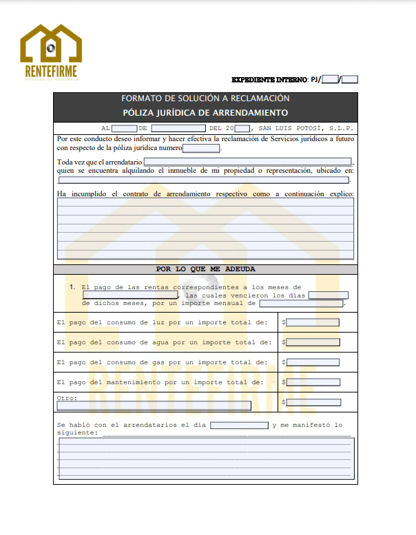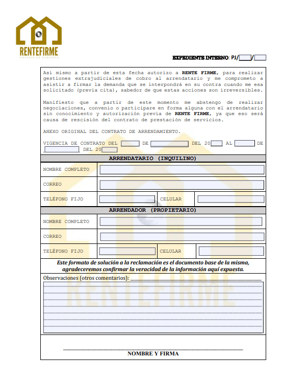 Para hacer valido el seguro de póliza jurídica, el propietario cuenta con 15 días hábiles a partir de la fecha del último pago que no realizó el inquilino o surja algún siniestro en el inmueble, para notificar a la afianzador, deberá enviar el formato de solicitud de queja al correo rentefirma@gmail.com, a partir de ese momento la empresa RENTE FIRME S.A DE C.V. se hace cargo de las negociaciones y acuerdos con el inquilino Extraoficial de Rente Firma, habrá incumplimiento del contrato de prestación de servicios profesionales por parte del cliente y no se hará valido el seguro de Póliza Jurídica de Arrendamiento.